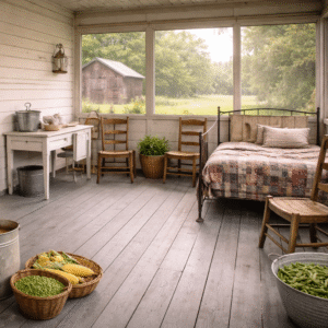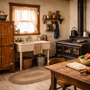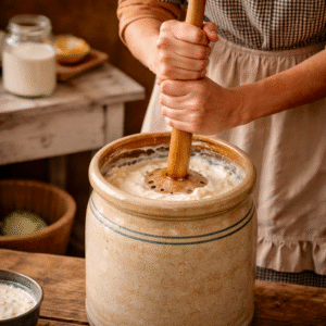 Mixing was done by hand, or with a hand-cranked egg beater whose steady rhythm became part of the kitchen’s music. Butter was churned not by machine, but by persistence—cream in a stoneware butter churn worked with a wooden dasher until it separated into butter and buttermilk. Even the simplest tasks required time, strength, and patience.